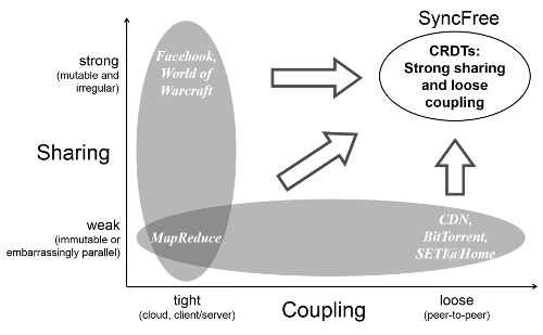 SyncFree proposes to solve these problems by using a recent, principled approach to enabling strong sharing called Conflict-Free Replicated Data Types (CRDTs). CRDTs avoid the complexities of ad-hoc approaches, while maintaining the scalability advantage. The insight is that, by following some simple mathematical principles (for example commutativity), distributed updates can occur without synchronization, while still ensuring a level of data consistency that enables the development of powerful applications. Furthermore, CRDTs ease development by encapsulating the replication and concurrency properties of common shared objects, such as sets, maps, sequences, or graphs.
